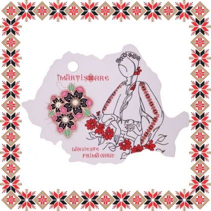 Martisor ambalat pe carton de culoare bej reprezentand harta Romaniei cu desen doamna Primavara cu motive traditionale romanesti. Cartonul este inscriptionat cu urarea Daruieste Primavara!