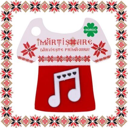 Martisor ambalat pe carton de culoare bej in forma de ie romaneasca cu motive traditionale romanesti si catifea de culoare rosie. Cartonul este inscriptionat cu urarea Daruieste Primavara si Noroc intr-un trifoias cu patru foi verde!