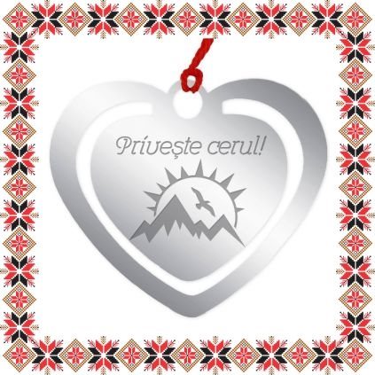 Semn de carte martisor in forma de inima din inox de culoare argintie gravata cu drag cu peisaj cu pasare, munti si soare si mesajul Priveste cerul! Daruieste povesti de martisor!