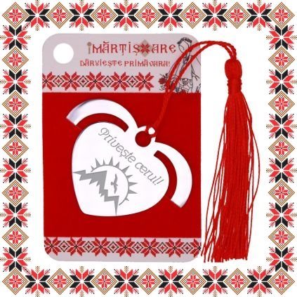 Semn de carte martisor in forma de inima din inox de culoare argintie gravata cu drag cu peisaj cu pasare, munti si soare si mesajul Priveste cerul! Daruieste povesti de martisor! Semnul de carte cu ciucuras rosu se prinde de 2-3 pagini si pe langa faptul ca-ti aminteste pagina la care ai ramas, poarta cu el un mesaj gravat cu bucurie special pentru tine.
