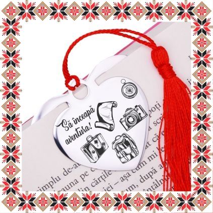 Semn de carte martisor in forma de inima din inox de culoare argintie gravata cu drag cu geanta, rucsac, pergament, busola, aparat de fotografiat si mesajul Sa inceapa aventura! Daruieste povesti de martisor! Semnul de carte cu ciucuras rosu se prinde de 2-3 pagini si pe langa faptul ca-ti aminteste pagina la care ai ramas, poarta cu el un mesaj gravat cu bucurie special pentru tine.