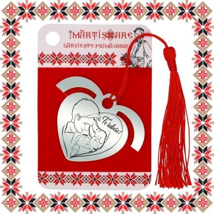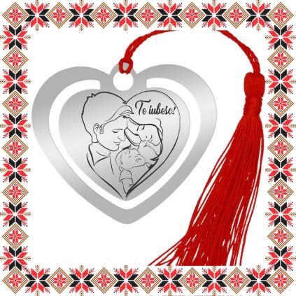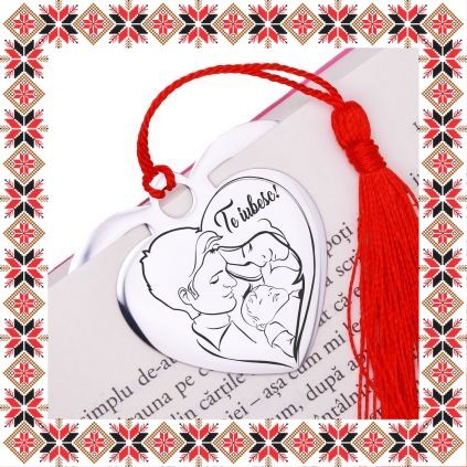 Semn de carte martisor in forma de inima din inox de culoare argintie gravata cu drag cu imaginea familii cu bebelus si mesajul Te iubesc! Daruieste povesti de martisor! Semnul de carte cu ciucuras rosu se prinde de 2-3 pagini si pe langa faptul ca-ti aminteste pagina la care ai ramas, poarta cu el un mesaj gravat cu bucurie special pentru tine.