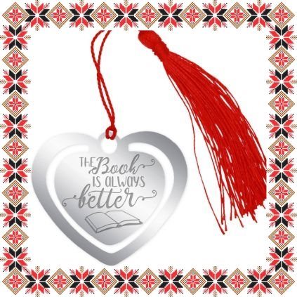 Semn de carte martisor in forma de inima din inox de culoare argintie gravata cu drag cu o carte deschisa si mesajul Cartea este mereu mai buna! Daruieste povesti de martisor! Semnul de carte cu ciucuras rosu se prinde de 2-3 pagini si pe langa faptul ca-ti aminteste pagina la care ai ramas, poarta cu el un mesaj gravat cu bucurie special pentru tine.