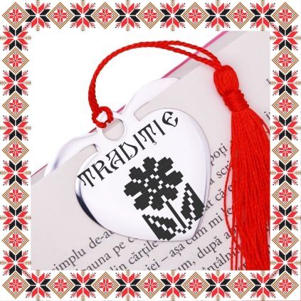 Semn de carte martisor in forma de inima din inox de culoare argintie gravata cu drag cu floare cu motive traditionale romanesti si cuvantul Traditie! Daruieste povesti de martisor! Semnul de carte cu ciucuras rosu se prinde de 2-3 pagini si pe langa faptul ca-ti aminteste pagina la care ai ramas, poarta cu el un mesaj gravat cu bucurie special pentru tine.