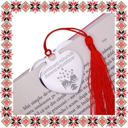 Semn de carte martisor in forma de inima din inox de culoare argintie gravata cu drag cu o carte in maini cu litere si urarea O primavara minunata, doamna educatoare! Daruieste povesti de martisor! Semnul de carte cu ciucuras rosu se prinde de 2-3 pagini si pe langa faptul ca-ti aminteste pagina la care ai ramas, poarta cu el un mesaj gravat cu bucurie special pentru tine.