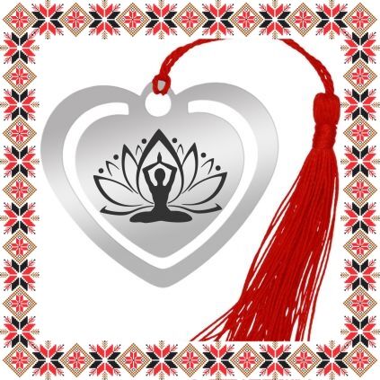 Semn de carte martisor in forma de inima din inox de culoare argintie gravata cu drag cu floare de lotus si silueta in pozitie de meditatie! Daruieste liniste de martisor! Semnul de carte cu ciucuras rosu se prinde de 2-3 pagini si pe langa faptul ca-ti aminteste pagina la care ai ramas, poarta cu el un mesaj gravat cu bucurie special pentru tine.