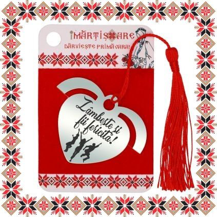 Semn de carte martisor in forma de inima din inox de culoare argintie gravata cu drag cu siluete bucuroase si mesajul Zambeste si fii fericita! Daruieste povesti de martisor! Semnul de carte cu ciucuras rosu se prinde de 2-3 pagini si pe langa faptul ca-ti aminteste pagina la care ai ramas, poarta cu el un mesaj gravat cu bucurie special pentru tine.