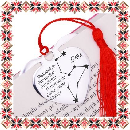 Semn de carte martisor in forma de inima din inox de culoare argintie gravata cu drag cu constelatia zodiei leu si calitatile specifice zodiei: popularitate, romantism, pozitivism, consecventa, generozitate, rigoare! Daruieste povesti de martisor! Semnul de carte cu ciucuras rosu se prinde de 2-3 pagini si pe langa faptul ca-ti aminteste pagina la care ai ramas, poarta cu el un mesaj gravat cu bucurie special pentru tine.