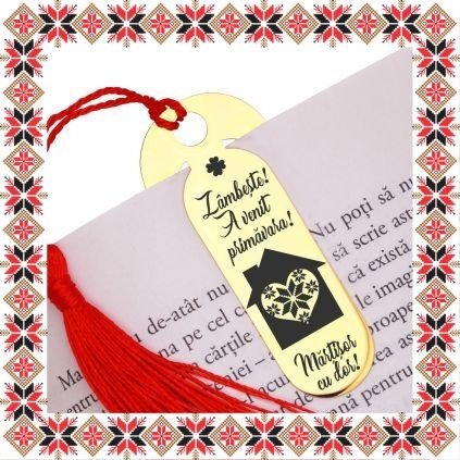 Semn de carte martisor in forma ovala realizat din inox de culoare aurie, gravat cu drag cu casuta cu inima din motive traditionale romanesti, trifoi si mesajul Zambeste! A venit primavara! Martisor cu dor! Daruieste povesti de martisor! Semnul de carte cu ciucuras rosu se prinde de 2-3 pagini si pe langa faptul ca-ti aminteste pagina la care ai ramas, poarta cu el un mesaj gravat cu bucurie special pentru tine.