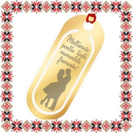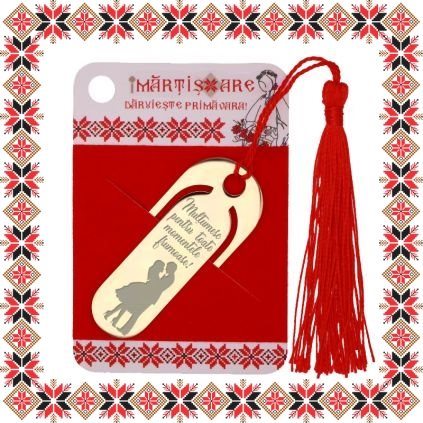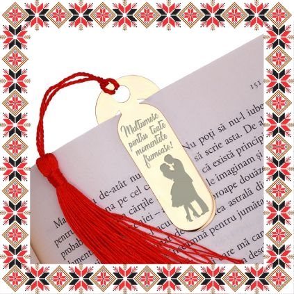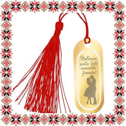 Semn de carte martisor in forma ovala realizat din inox de culoare aurie, gravat cu drag cu doi indragostiti care se privesc si mesajul Multumesc pentru toate momentele frumoase! Daruieste povesti de martisor! Semnul de carte cu ciucuras rosu se prinde de 2-3 pagini si pe langa faptul ca-ti aminteste pagina la care ai ramas, poarta cu el un mesaj gravat cu bucurie special pentru tine.
