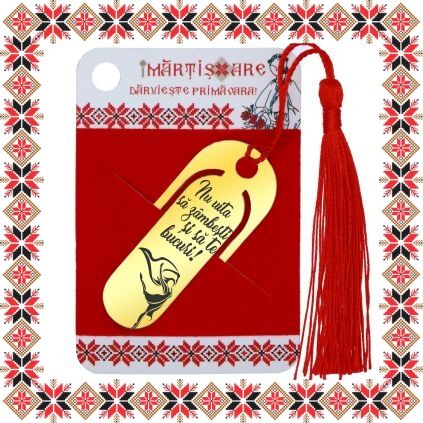 Semn de carte martisor in forma ovala realizat din inox de culoare aurie, gravat cu drag cu o balerina si mesajul Nu uita sa zambesti si sa te bucuri! Daruieste povesti de martisor! Semnul de carte cu ciucuras rosu se prinde de 2-3 pagini si pe langa faptul ca-ti aminteste pagina la care ai ramas, poarta cu el un mesaj gravat cu bucurie special pentru tine.
