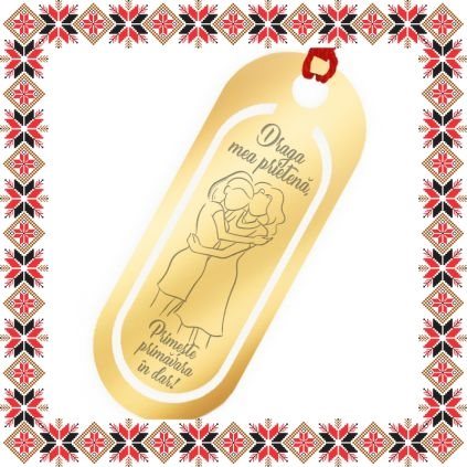 Semn de carte martisor in forma ovala realizat din inox de culoare aurie, gravat cu drag cu doua prietene/ surori tinandu-se in brate si mesajul Draga mea prietena, primeste primavara in dar! Daruieste povesti de martisor! Semnul de carte cu ciucuras rosu se prinde de 2-3 pagini si pe langa faptul ca-ti aminteste pagina la care ai ramas, poarta cu el un mesaj gravat cu bucurie special pentru tine.