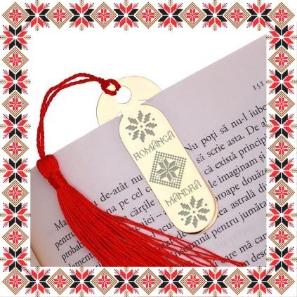 Semn de carte martisor in forma ovala realizat din inox de culoare aurie, gravat cu drag flori motive traditionale romanesti si mesajul Romanca Mandra! Daruieste povesti de martisor! Semnul de carte cu ciucuras rosu se prinde de 2-3 pagini si pe langa faptul ca-ti aminteste pagina la care ai ramas, poarta cu el un mesaj gravat cu bucurie special pentru tine.