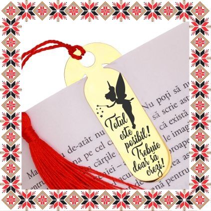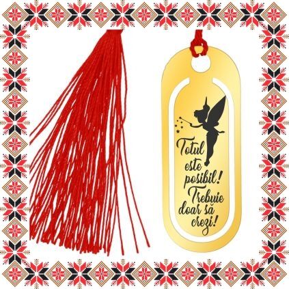 Semn de carte martisor in forma ovala realizat din inox de culoare aurie, gravat cu drag cu zana si mesajul Totul este posibil! Trebuie doar sa crezi! Daruieste povesti de martisor! Semnul de carte cu ciucuras rosu se prinde de 2-3 pagini si pe langa faptul ca-ti aminteste pagina la care ai ramas, poarta cu el un mesaj gravat cu bucurie special pentru tine.