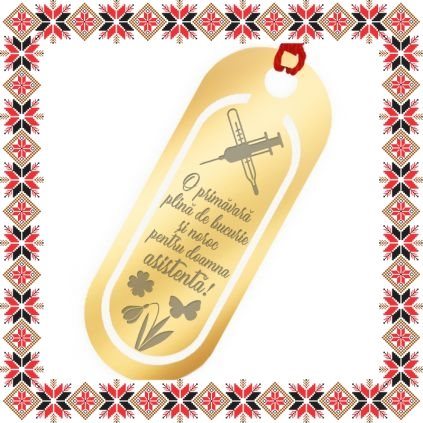 Semn de carte martisor in forma ovala realizat din inox de culoare aurie, gravat cu drag cu termometru, seringa, simboluri si mesajul O primavara plina de bucurie si noroc pentru doamna asistenta! Daruieste povesti de martisor! Semnul de carte cu ciucuras rosu se prinde de 2-3 pagini si pe langa faptul ca-ti aminteste pagina la care ai ramas, poarta cu el un mesaj gravat cu bucurie special pentru tine.