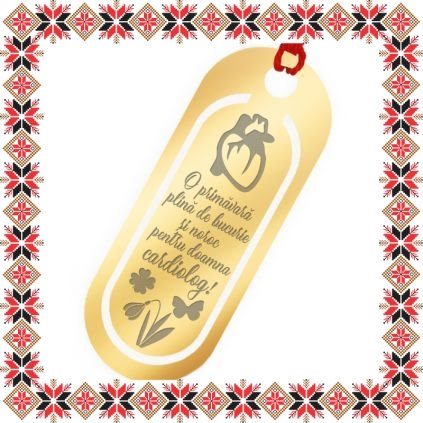 Semn de carte martisor in forma ovala realizat din inox de culoare aurie, gravat cu drag cu ghiocel, trifoi, fluture, inima si mesajul O primavara plina de bucurie si noroc pentru doamna cardiolog! Daruieste povesti de martisor! Semnul de carte cu ciucuras rosu se prinde de 2-3 pagini si pe langa faptul ca-ti aminteste pagina la care ai ramas, poarta cu el un mesaj gravat cu bucurie special pentru tine.