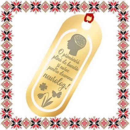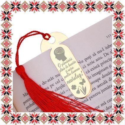 Semn de carte martisor in forma ovala realizat din inox de culoare aurie, gravat cu trifoi, ghiocel, fluture si mesajul O primavara plina de bucurie si noroc pentru doamna neurolog! Daruieste povesti de martisor! Semnul de carte cu ciucuras rosu se prinde de 2-3 pagini si pe langa faptul ca-ti aminteste pagina la care ai ramas, poarta cu el un mesaj gravat cu bucurie special pentru tine.