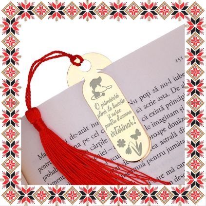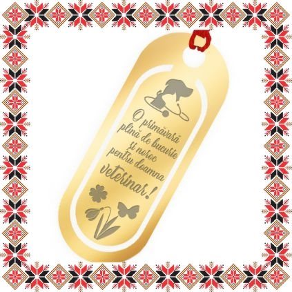 Semn de carte martisor in forma ovala realizat din inox de culoare aurie, gravat cu trifoi, ghiocel, fluture, catel, pisica si mesajul O primavara plina de bucurie si noroc pentru doamna veterinar! Daruieste povesti de martisor! Semnul de carte cu ciucuras rosu se prinde de 2-3 pagini si pe langa faptul ca-ti aminteste pagina la care ai ramas, poarta cu el un mesaj gravat cu bucurie special pentru tine.
