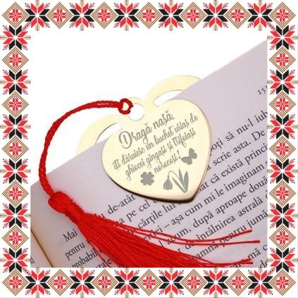 Semn de carte martisor in forma de inima din inox de culoare aurie gravata cu drag cu simbolurie norocoase, trifoi, ghiocel si fluture si mesajul Draga nasa, iti daruiesc un buchet urias de ghiocei gingasi si trifoiasi norocosi! Daruieste povesti de martisor! Semnul de carte cu ciucuras rosu se prinde de 2-3 pagini si pe langa faptul ca-ti aminteste pagina la care ai ramas, poarta cu el un mesaj gravat cu bucurie special pentru tine.