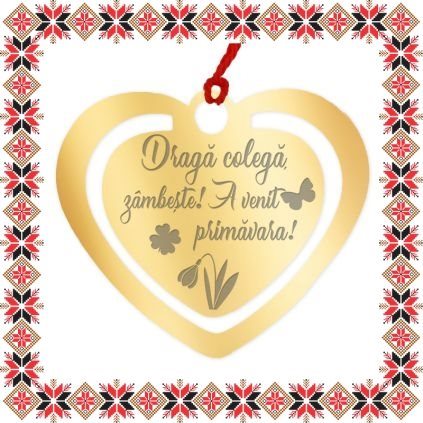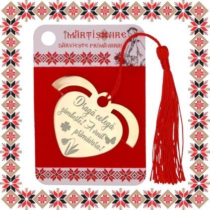 Semn de carte martisor in forma de inima din inox de culoare aurie gravata cu drag cu simbolurie norocoase, trifoi, ghiocel si fluture si mesajul Draga colega, zambeste! A venit primavara! Daruieste povesti de martisor! Semnul de carte cu ciucuras rosu se prinde de 2-3 pagini si pe langa faptul ca-ti aminteste pagina la care ai ramas, poarta cu el un mesaj gravat cu bucurie special pentru tine.