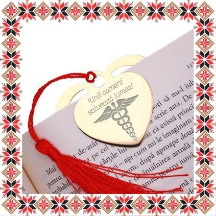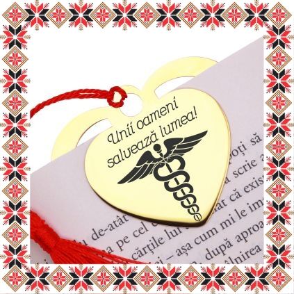 Semn de carte martisor in forma de inima din inox de culoare aurie gravata cu drag cu simbolul medicinii si mesajul Unii oameni salveaza lumea! Daruieste povesti de martisor! Semnul de carte cu ciucuras rosu se prinde de 2-3 pagini si pe langa faptul ca-ti aminteste pagina la care ai ramas, poarta cu el un mesaj gravat cu bucurie special pentru tine.