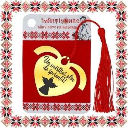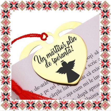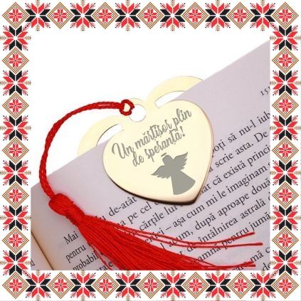 Semn de carte martisor in forma de inima din inox de culoare aurie gravata cu drag cu ingeras si mesajul Un martisor plin de speranta! Daruieste povesti de martisor! Semnul de carte cu ciucuras rosu se prinde de 2-3 pagini si pe langa faptul ca-ti aminteste pagina la care ai ramas, poarta cu el un mesaj gravat cu bucurie special pentru tine.