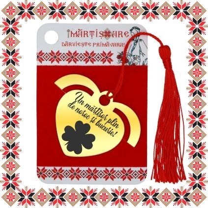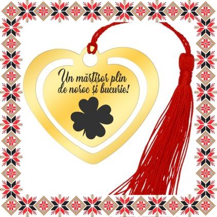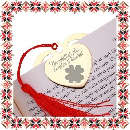 Semn de carte martisor in forma de inima din inox de culoare aurie gravata cu drag cu trifoi cu patru foi si mesajul Un martisor plin de noroc si bucurie! Daruieste povesti de martisor! Semnul de carte cu ciucuras rosu se prinde de 2-3 pagini si pe langa faptul ca-ti aminteste pagina la care ai ramas, poarta cu el un mesaj gravat cu bucurie special pentru tine.