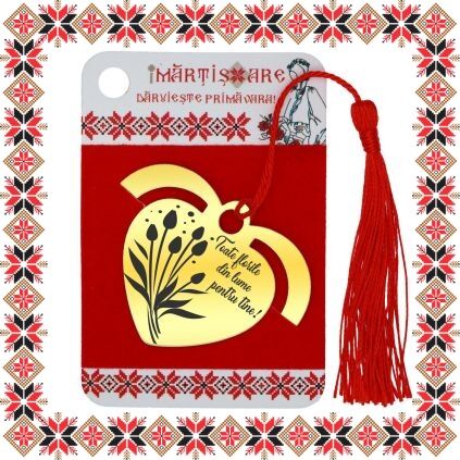 Martisor ambalat pe suport de carton de culoare bej cu desene motive traditionale romanesti si catifea rosie. Ambalajul este inscriptionat cu urarea Daruieste Primavara!