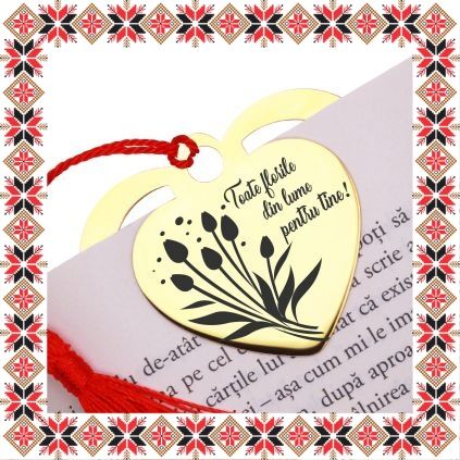 Semn de carte martisor in forma de inima din inox de culoare aurie gravata cu drag cu un buchet de lalele si mesajul Toate florile din lume pentru tine! Daruieste povesti de martisor! Semnul de carte cu ciucuras rosu se prinde de 2-3 pagini si pe langa faptul ca-ti aminteste pagina la care ai ramas, poarta cu el un mesaj gravat cu bucurie special pentru tine.