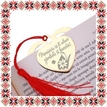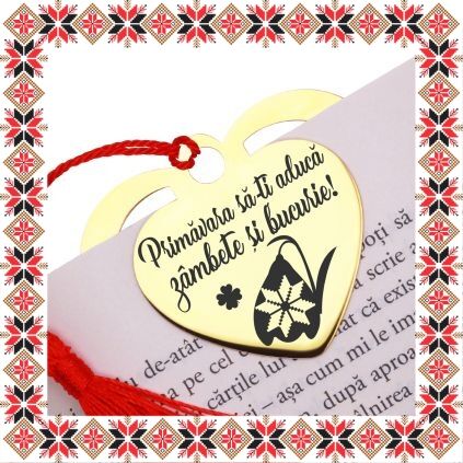 Semn de carte martisor in forma de inima din inox de culoare aurie gravata cu drag cu ghiocel cu motive traditionale romanesti, trifoi si mesajul primavara sa-ti aduca zambete si bucurie! Daruieste povesti de martisor! Semnul de carte cu ciucuras rosu se prinde de 2-3 pagini si pe langa faptul ca-ti aminteste pagina la care ai ramas, poarta cu el un mesaj gravat cu bucurie special pentru tine.