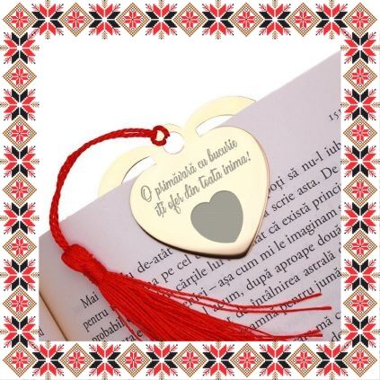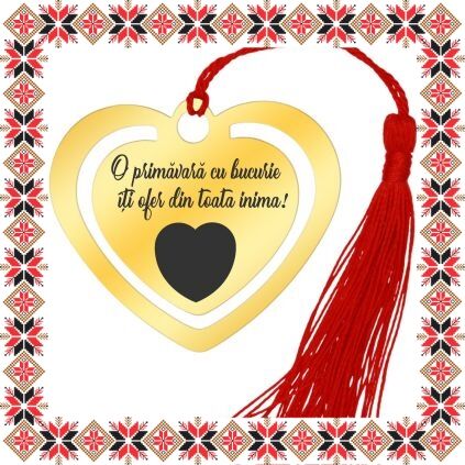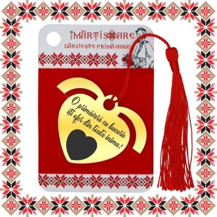 Semn de carte martisor in forma de inima din inox de culoare aurie gravata cu drag cu inimioara si mesajul O primavara cu bucurie iti ofer din toata inima! Daruieste povesti de martisor! Semnul de carte cu ciucuras rosu se prinde de 2-3 pagini si pe langa faptul ca-ti aminteste pagina la care ai ramas, poarta cu el un mesaj gravat cu bucurie special pentru tine.