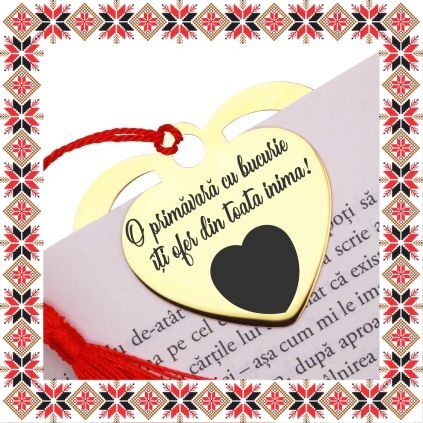 Semn de carte martisor in forma de inima din inox de culoare aurie gravata cu drag cu inimioara si mesajul O primavara cu bucurie iti ofer din toata inima! Daruieste povesti de martisor!