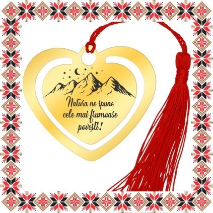 Semn de carte martisor in forma de inima din inox de culoare aurie gravata cu drag cu munti stele si semiluna si mesajul Natura ne spune cele mai frumoase povesti! Daruieste povesti de martisor! Semnul de carte cu ciucuras rosu se prinde de 2-3 pagini si pe langa faptul ca-ti aminteste pagina la care ai ramas, poarta cu el un mesaj gravat cu bucurie special pentru tine.