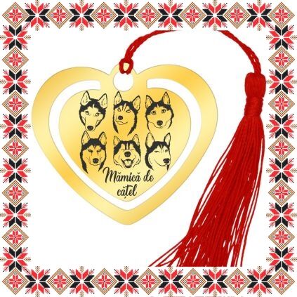 Semn de carte martisor in forma de inima din inox de culoare aurie gravata cu drag cu chipurile unui catel in diferite ipostaze si mesajul Mamica de catel! Daruieste povesti de martisor! Semnul de carte cu ciucuras rosu se prinde de 2-3 pagini si pe langa faptul ca-ti aminteste pagina la care ai ramas, poarta cu el un mesaj gravat cu bucurie special pentru tine.