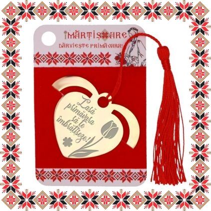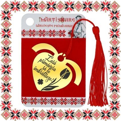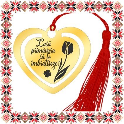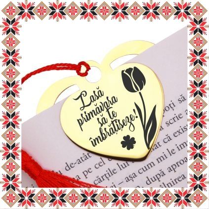 Semn de carte martisor in forma de inima din inox de culoare aurie gravata cu drag cu trifoi cu patru foi, lalea si mesajul Lasa primavara sa te imbratiseze! Daruieste povesti de martisor! Semnul de carte cu ciucuras rosu se prinde de 2-3 pagini si pe langa faptul ca-ti aminteste pagina la care ai ramas, poarta cu el un mesaj gravat cu bucurie special pentru tine.