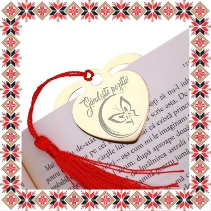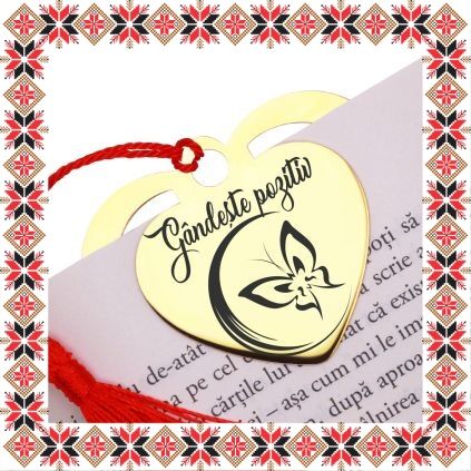 Semn de carte martisor in forma de inima din inox de culoare aurie gravata cu drag cu un fluture in zbor si mesajul Gandeste pozitiv. Daruieste povesti de martisor! Semnul de carte cu ciucuras rosu se prinde de 2-3 pagini si pe langa faptul ca-ti aminteste pagina la care ai ramas, poarta cu el un mesaj gravat cu bucurie special pentru tine.