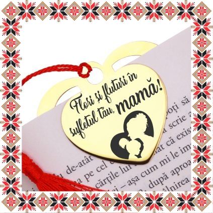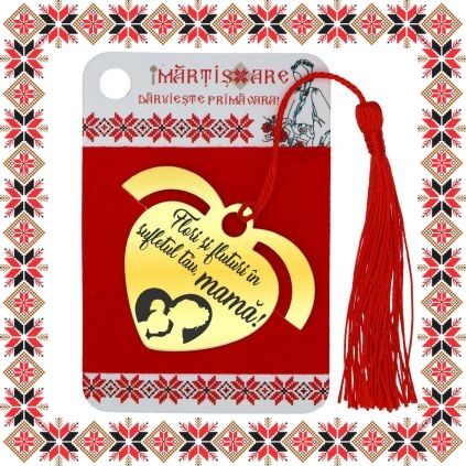 Semn de carte martisor in forma de inima din inox de culoare aurie gravata cu drag cu o inima cu mama si fiica si mesajul Flori si fluturi in sufletul tau, mama! Daruieste povesti de martisor! Semnul de carte cu ciucuras rosu se prinde de 2-3 pagini si pe langa faptul ca-ti aminteste pagina la care ai ramas, poarta cu el un mesaj gravat cu bucurie special pentru tine.