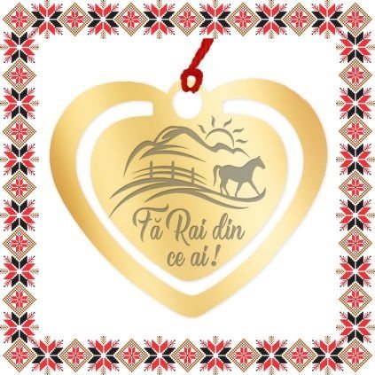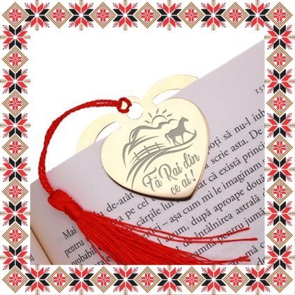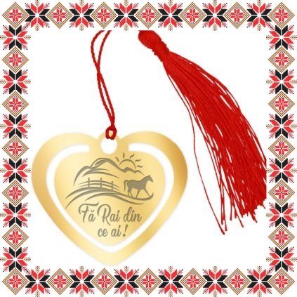 Semn de carte martisor in forma de inima din inox de culoare aurie gravata cu drag cu un peisaj cu munti si soare si mesajul Fa Rai din cei ai! Daruieste povesti de martisor! Semnul de carte cu ciucuras rosu se prinde de 2-3 pagini si pe langa faptul ca-ti aminteste pagina la care ai ramas, poarta cu el un mesaj gravat cu bucurie special pentru tine.