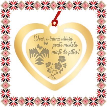 Semn de carte martisor in forma de inima din inox de culoare aurie gravata cu drag fluturi, carte si flori de cires si mesajul Doar o inima uriasa poate modela minti de pitici! Daruieste povesti de martisor!