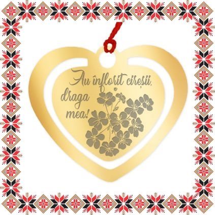 Semn de carte martisor in forma de inima din inox de culoare aurie gravata cu drag cu flori de cires si mesajul Au inflori ciresii draga mea! Daruieste povesti de martisor!