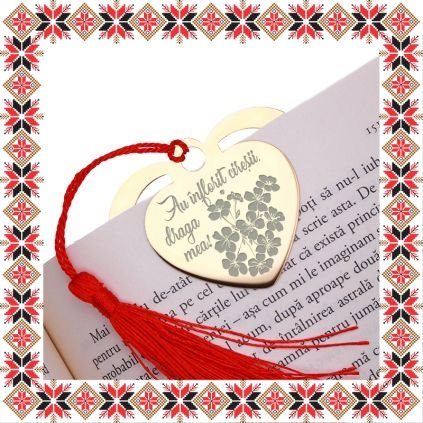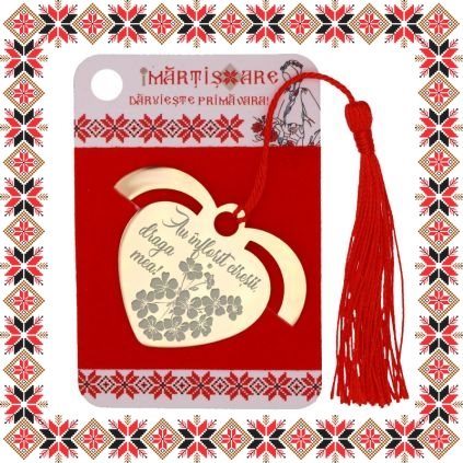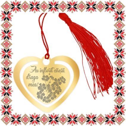 Semn de carte martisor in forma de inima din inox de culoare aurie gravata cu drag cu flori de cires si mesajul Au inflori ciresii draga mea! Daruieste povesti de martisor! Semnul de carte cu ciucuras rosu se prinde de 2-3 pagini si pe langa faptul ca-ti aminteste pagina la care ai ramas, poarta cu el un mesaj gravat cu bucurie special pentru tine.