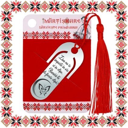 Semn de carte martisor in forma ovala realizat din inox de culoare argintie, gravat cu fluture si mesajul Ziua nu se imparte in ore ci in clipe. Bucura-te de fiecare clipa! Daruieste povesti de martisor! Semnul de carte cu ciucuras rosu se prinde de 2-3 pagini si pe langa faptul ca-ti aminteste pagina la care ai ramas, poarta cu el un mesaj gravat cu bucurie special pentru tine.