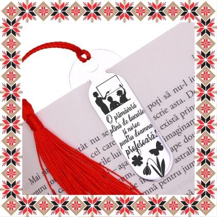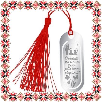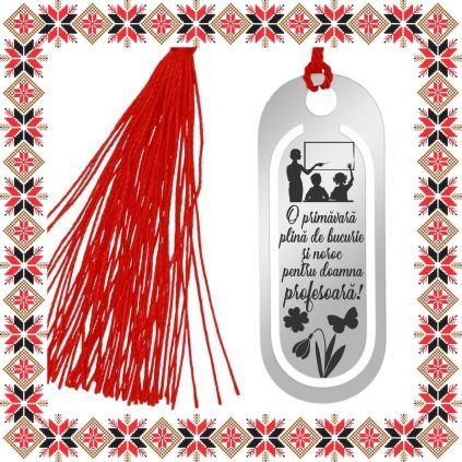 Semn de carte martisor in forma ovala realizat din inox de culoare argintie, gravat cu trifoi, ghiocel, fluture si mesajul O primavara plina de bucurie si noroc pentru doamna profesoara! Daruieste povesti de martisor! Semnul de carte cu ciucuras rosu se prinde de 2-3 pagini si pe langa faptul ca-ti aminteste pagina la care ai ramas, poarta cu el un mesaj gravat cu bucurie special pentru tine.