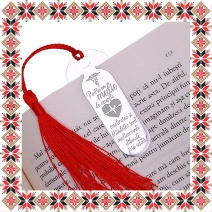 Semn de carte martisor in forma ovala realizat din inox de culoare argintie, gravat cu inima, ritm cardiac, simbolul medicinii si mesajul Pentru un medic de exceptie implicarea si blandetea sunt medicamente eliberate fara reteta! Daruieste povesti de martisor! Semnul de carte cu ciucuras rosu se prinde de 2-3 pagini si pe langa faptul ca-ti aminteste pagina la care ai ramas, poarta cu el un mesaj gravat cu bucurie special pentru tine.