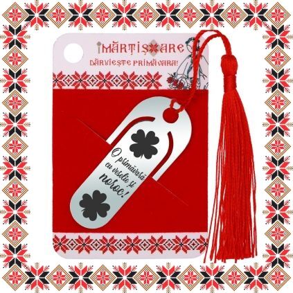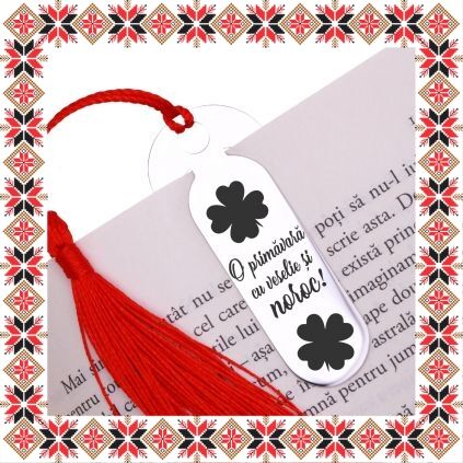 Semn de carte martisor in forma ovala realizat din inox de culoare argintie, gravat cu drag cu trifoi cu patru foi norocosi si mesajul O primavara cu veselie si noroc! Daruieste povesti de martisor! Semnul de carte cu ciucuras rosu se prinde de 2-3 pagini si pe langa faptul ca-ti aminteste pagina la care ai ramas, poarta cu el un mesaj gravat cu bucurie special pentru tine.
