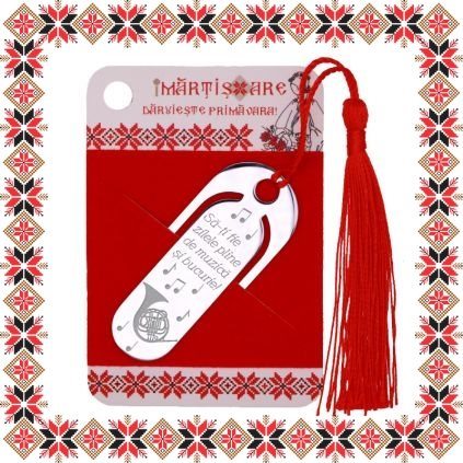 Semn de carte martisor in forma ovala realizat din inox de culoare argintie, gravat cu drag cu corn francez, note muzicale si mesajul Sa-ti fie zilele pline de muzica si bucurie! Daruieste muzica de martisor! Semnul de carte cu ciucuras rosu se prinde de 2-3 pagini si pe langa faptul ca-ti aminteste pagina la care ai ramas, poarta cu el un mesaj gravat cu bucurie special pentru tine.