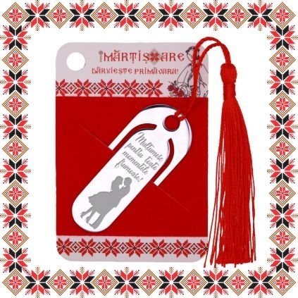 Semn de carte martisor in forma ovala realizat din inox de culoare argintie, gravat cu drag cu doi indragostiti care se privesc si mesajul Multumesc pentru toate momentele frumoase! Daruieste povesti de martisor! Semnul de carte cu ciucuras rosu se prinde de 2-3 pagini si pe langa faptul ca-ti aminteste pagina la care ai ramas, poarta cu el un mesaj gravat cu bucurie special pentru tine.