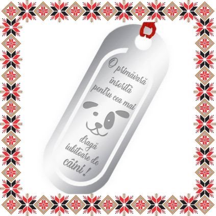 Semn de carte martisor in forma ovala realizat din inox de culoare argintie, gravat cu drag cu catel si mesajul O primavara insorita pentru cea mai draga iubitoare de caini! Daruieste povesti de martisor! Semnul de carte cu ciucuras rosu se prinde de 2-3 pagini si pe langa faptul ca-ti aminteste pagina la care ai ramas, poarta cu el un mesaj gravat cu bucurie special pentru tine.