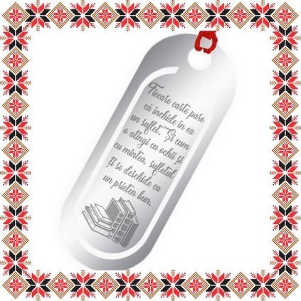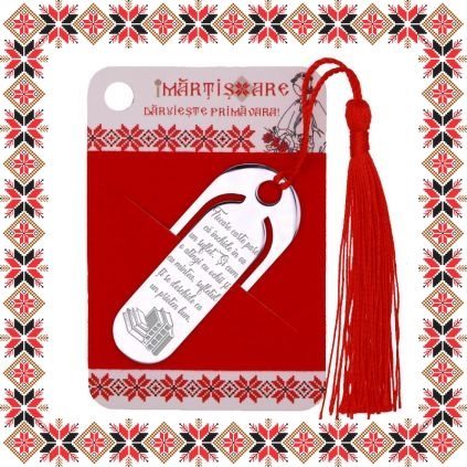 Semn de carte martisor in forma ovala realizat din inox de culoare argintie, gravat cu drag cu carti si mesajul Fiecare carte pare ca inchide in ea un suflet. Si cum o atingi cu ochii si cu mintea, sufletul ti se deschide ca un prieten bun. Daruieste povesti de martisor! Semnul de carte cu ciucuras rosu se prinde de 2-3 pagini si pe langa faptul ca-ti aminteste pagina la care ai ramas, poarta cu el un mesaj gravat cu bucurie special pentru tine.