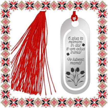 Semn de carte martisor in forma ovala realizat din inox de culoare argintie, gravat cu drag cu un buchet de lalele, trifoi si mesajul E ziua ta mamico, in dar ti-am adus inima! Te iubesc, mama! Daruieste povesti de martisor! Semnul de carte cu ciucuras rosu se prinde de 2-3 pagini si pe langa faptul ca-ti aminteste pagina la care ai ramas, poarta cu el un mesaj gravat cu bucurie special pentru tine.